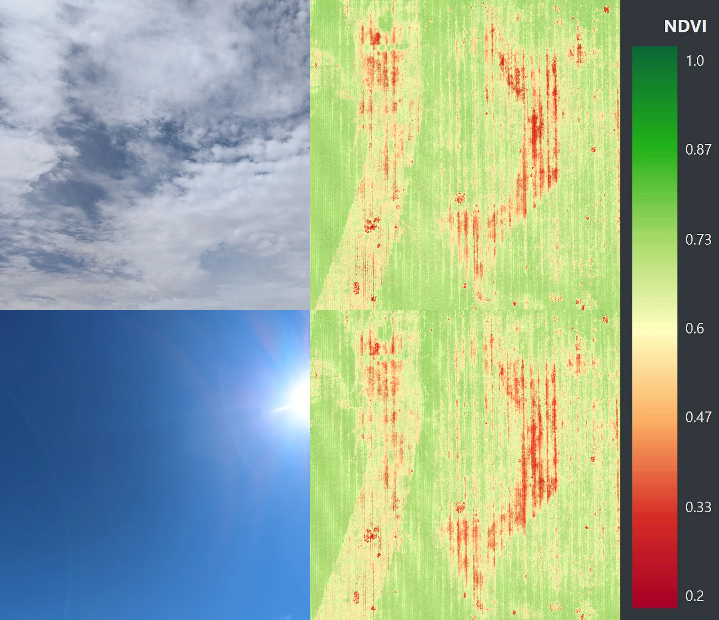 【技术验证】下图直观展示了使用光传感器消除云层干扰的效果:无论阴天或晴天,经校正的反射率测量值均保持稳定一致。