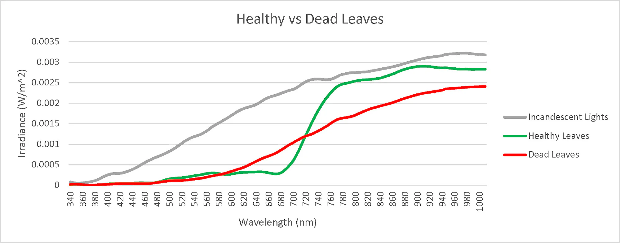 观察下方光谱图可清晰看到健康与衰败叶片在辐射照度上的差异。测试环境采用白炽灯照明,因其产生的光谱分布与太阳光最为接近。