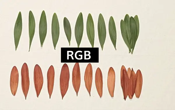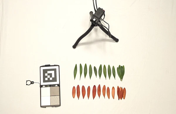 我们将健康与枯萎的叶片布置在白色棉质背景布上,光照环境采用前文光谱图所示的白炽灯光源。