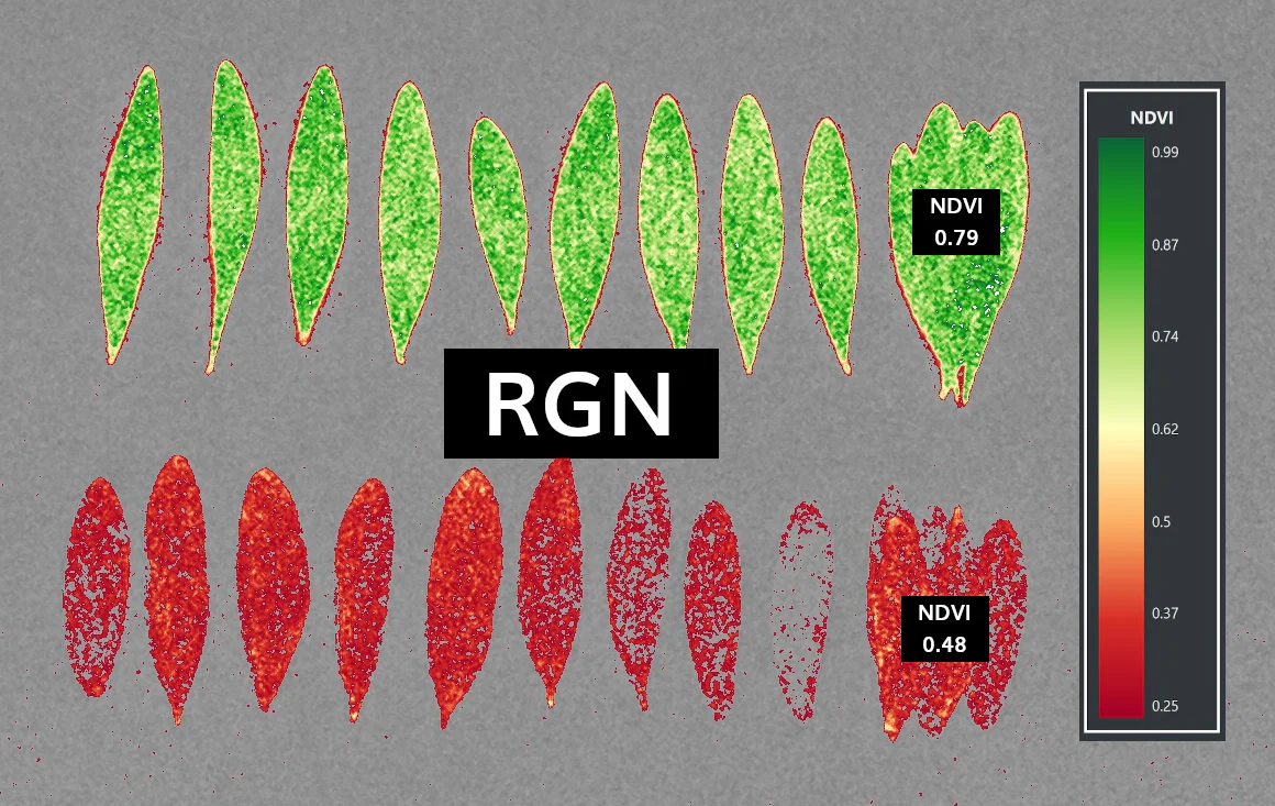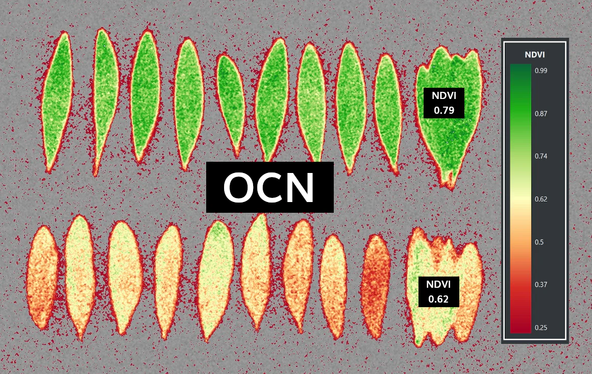 我们随后从光谱仪扫描数据中提取了对应RGN和OCN通道(半高宽范围)的波段,并计算出NDVI数值。这些计算得到的NDVI值已标注在画面右侧叶片区域的黑色方框内,具体数据如下: