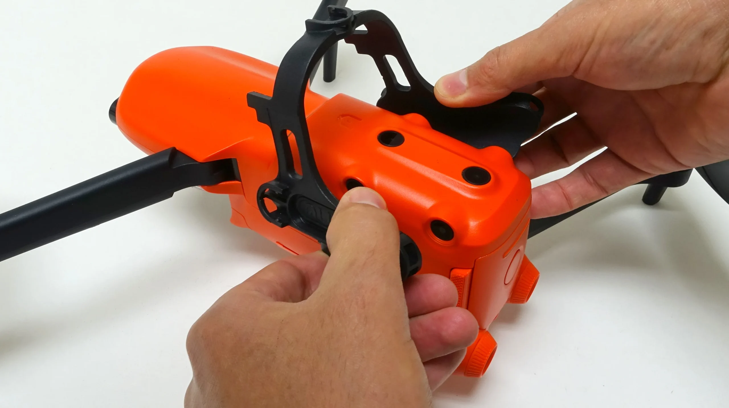 步骤3:将底部支撑卡扣就位。虽然非必需,但强烈建议安装此支撑件——当搭载额外负载(相机)时,它能确保鞍形挂载架与机身达到最佳贴合度。