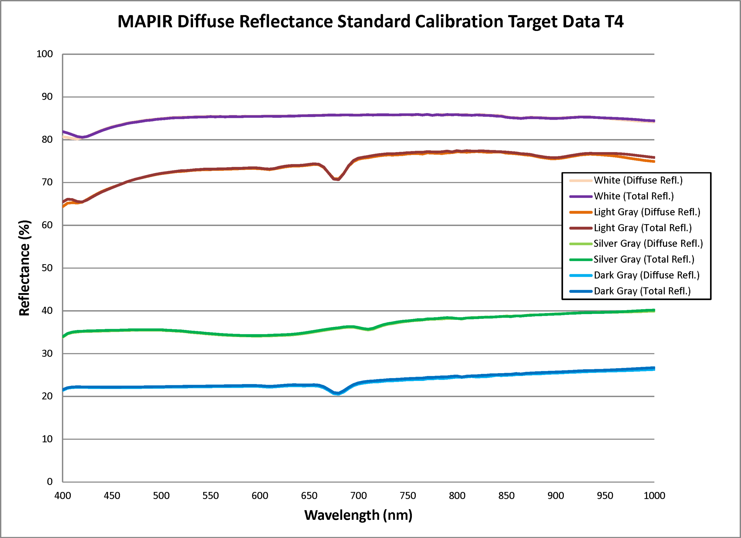 MAPIR 提供耐用的漫反射标准校准靶套装 (T4-R125),其中包含 4 个已知反射率的参考标准靶。使用多台配备积分球的岛津分光光度计,测量了 250-2500nm 波长范围内的漫反射率和总反射率百分比。由于漫反射和总反射特性相似,朗伯反射板可以从任意角度拍摄,但建议正面拍摄。我们的计算机视觉软件会自动识别靶图像中的二维码,并使用已知的靶材料反射率计算像素与反射率之间的关系(数据下载链接在此)。