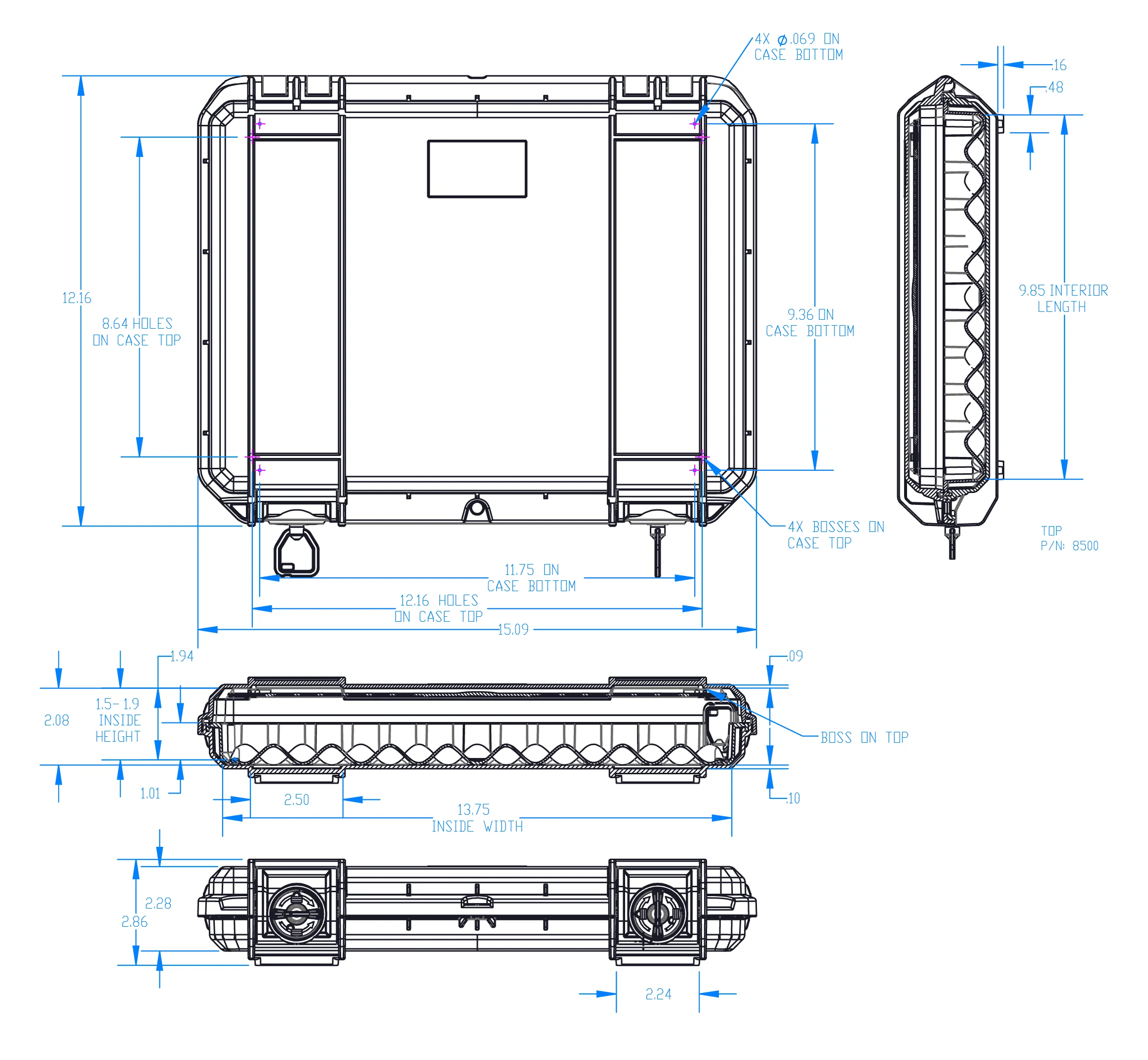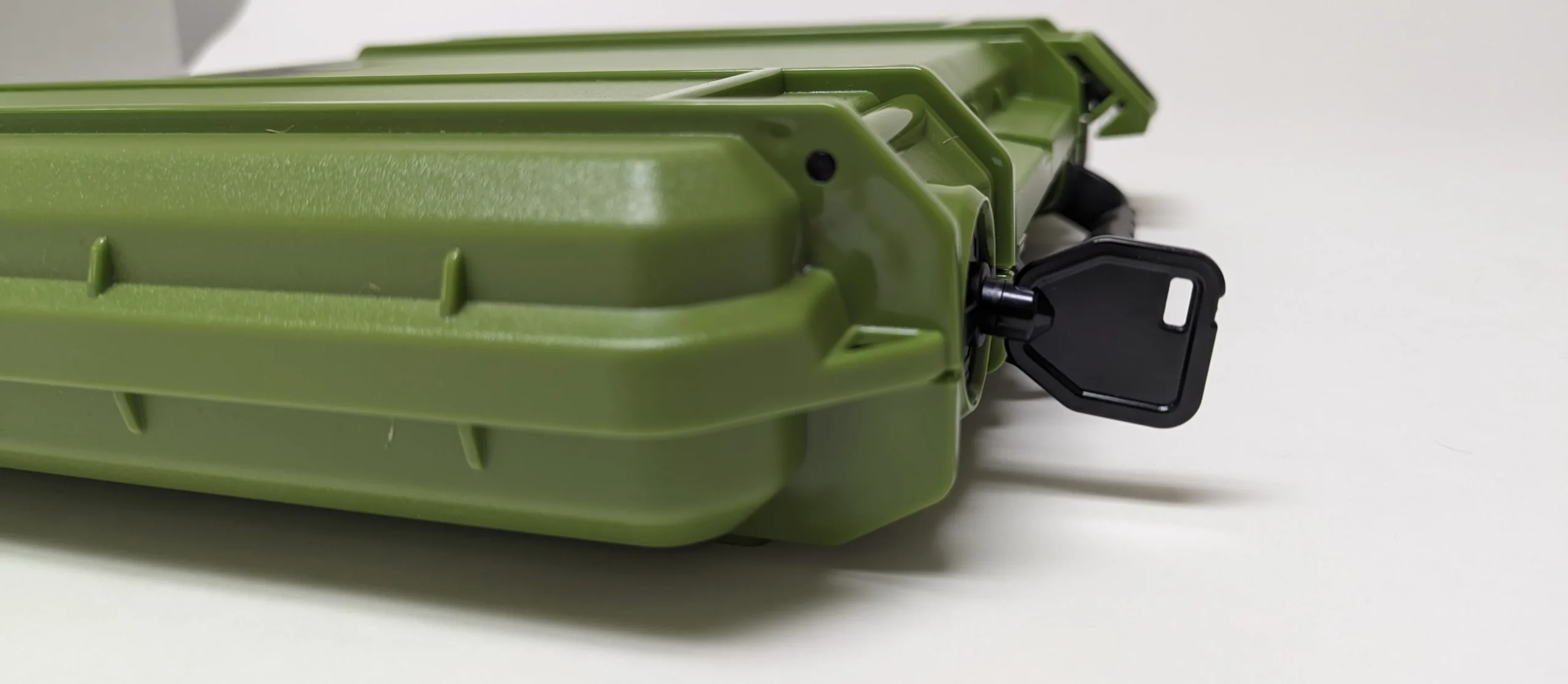 T4-R125 的绿色外壳具有抗冲击、防压、防尘和 IP67 防水等级(IP67 等级表示在锁扣状态下可在 1 米深的水下浸泡 30 分钟)。内置提手易于抓握,可旋转且灵活。两个大型铰链式搭扣可将箱体牢固地闭合。旋转黑色圆形锁扣即可将搭扣固定在箱体上,并附带两把备用钥匙,用于进一步锁定。提手之间的大孔还可用于加装挂锁(挂锁需另购)。
