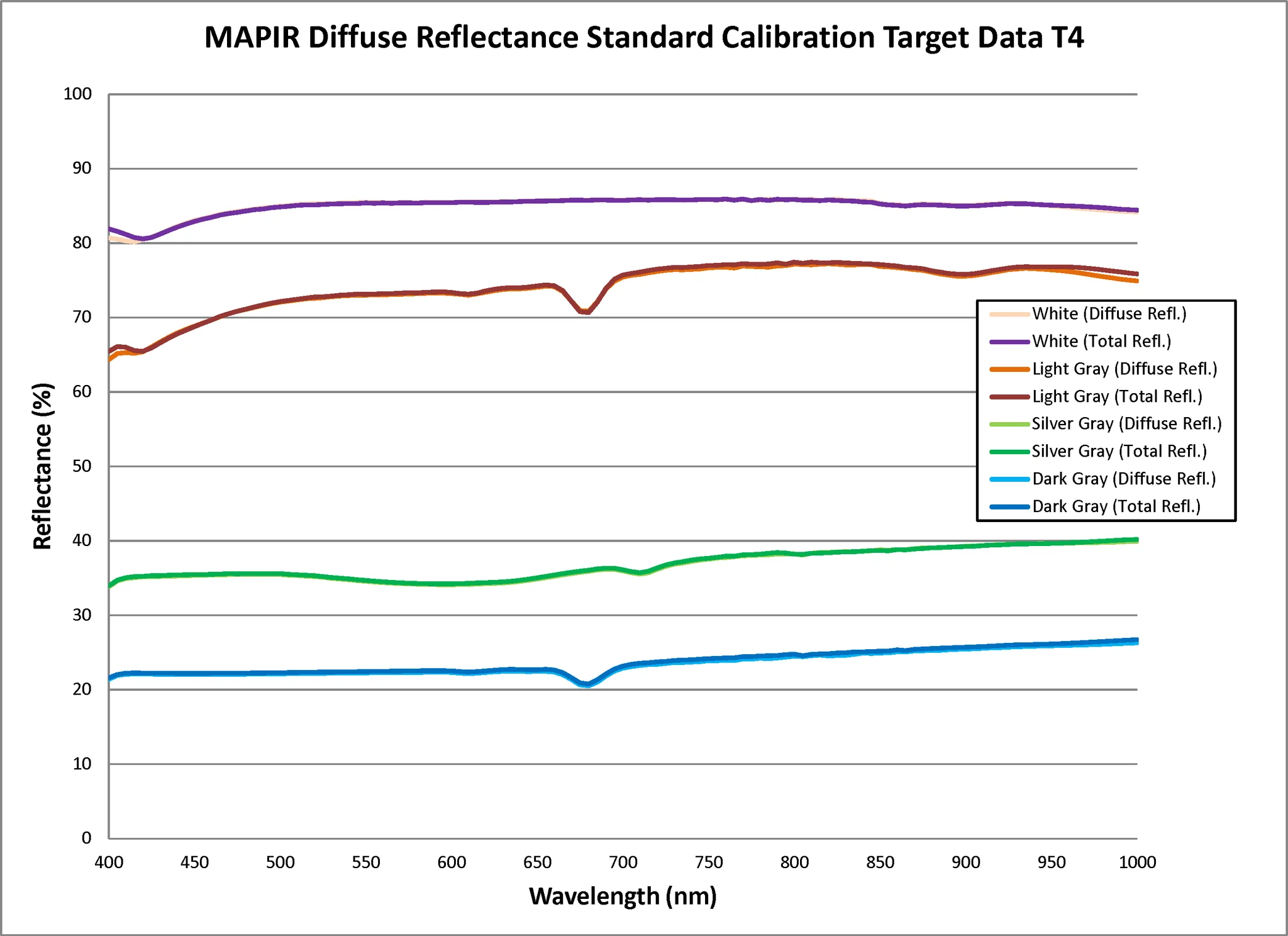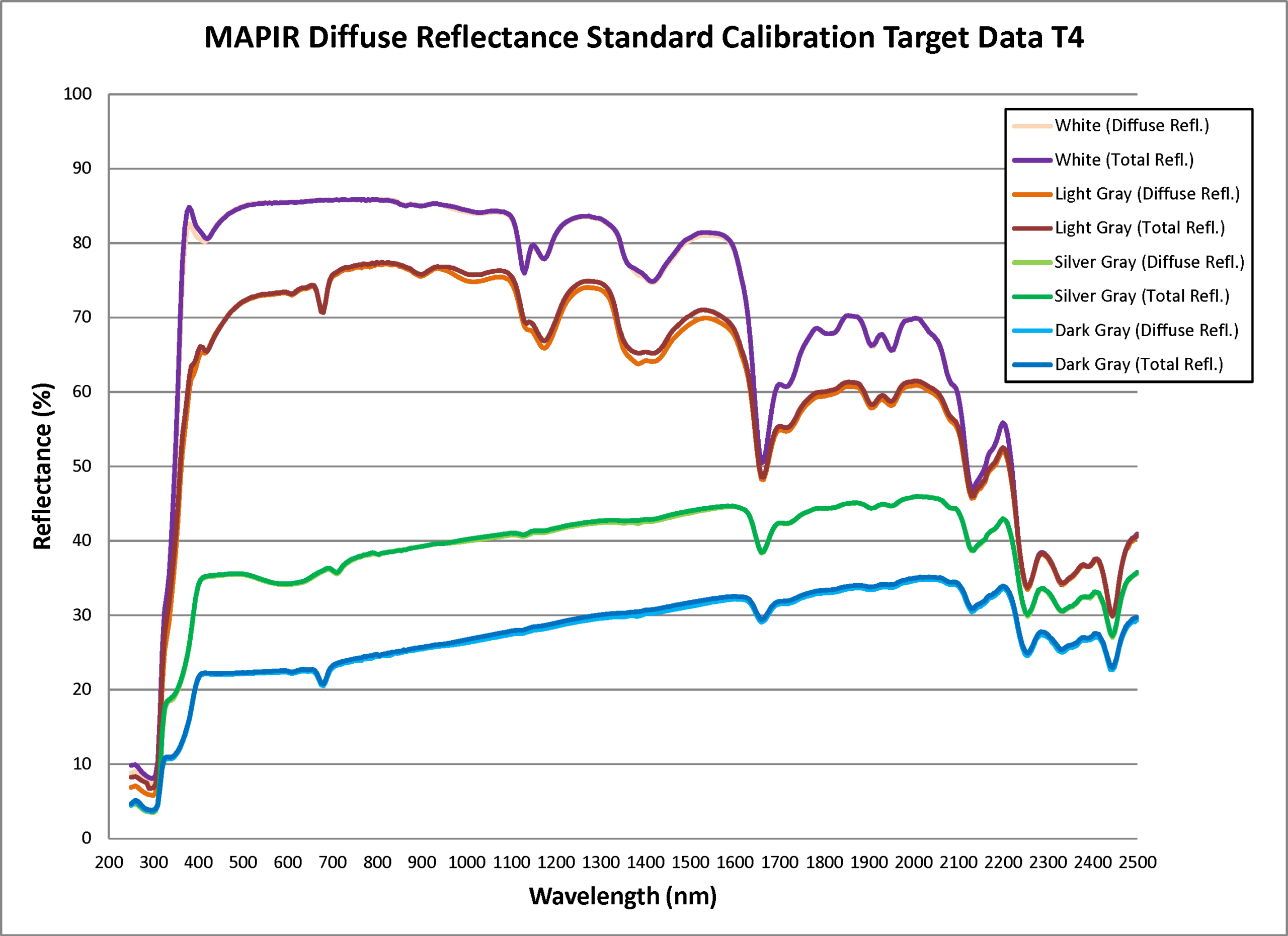 MAPIR offers our compact and durable Diffuse Reflectance Standard Calibration Target Package (T4-R50), which contains 4 reference standard targets of known reflectance. Diffuse and total reflectance percent measurements from 250-2500nm were made using multiple Shimadzu spectrophotometers incorporating an integrating sphere. The lambertian reflectance panels can be captured from any angle thanks to similar diffuse and total reflection properties, though capturing straight-on is recommended. Our computer vision software automatically finds the QR symbol in the target images and calculates the pixel to reflectance relationship using the known target material reflectance (data download here).