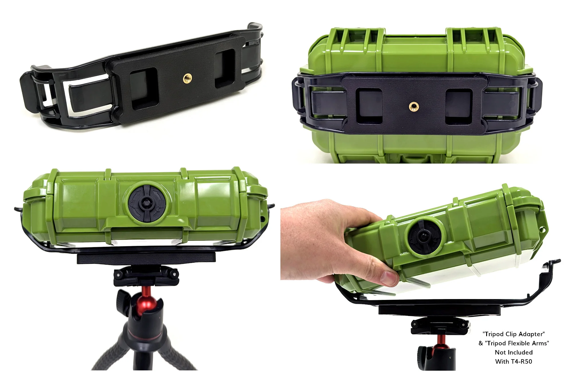 Easily attach the T4-R50 to a tripod (1/4-20) using our Tripod Clip Adapter (T4-R50). The clip securely attaches to the target housing and is easily removed with thumb tabs. No tools are required to attach the T4-R50 green housing to the black tripod clip adapter.