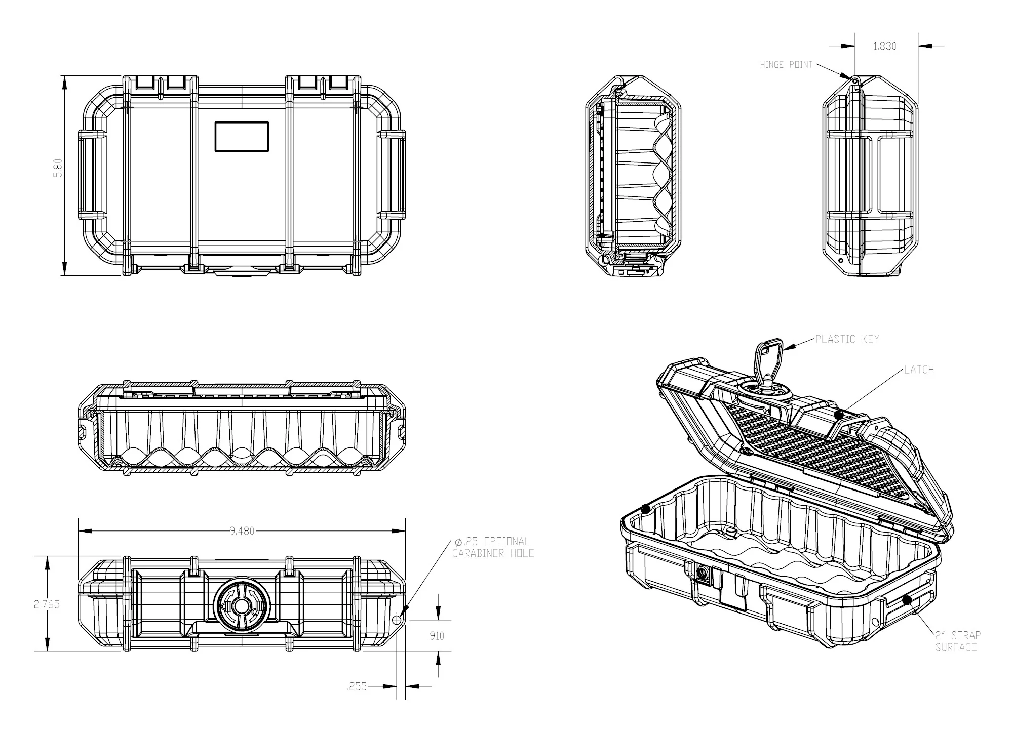 The green outer case of the T4-R50 is impact resistant, crushproof, dustproof and IP67 waterproof (IP67 rating = waterproof to a depth of 1 meter for 30 minutes when latched). It’s polypropylene plastic resists chemicals while protecting the internals from moisture. The large hinged clasp latches the halves securely. Twisting the black circular lock fastens the clasp to the case, and there are 2 additional keys included to further lock it. A hole for a carabiner or other clip is available on one of the shorter ends (see drawing).